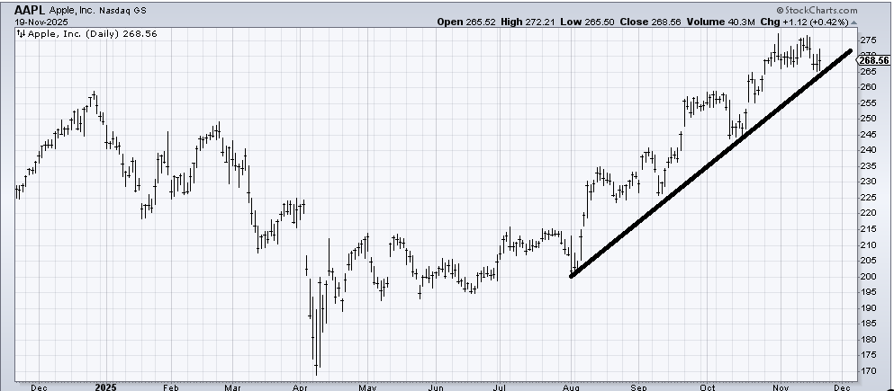 Apple (AAPL) has been up quite nicely since the summer, although for the year, it’s not up a ton. As long as it rides that line, it’s a good stock.