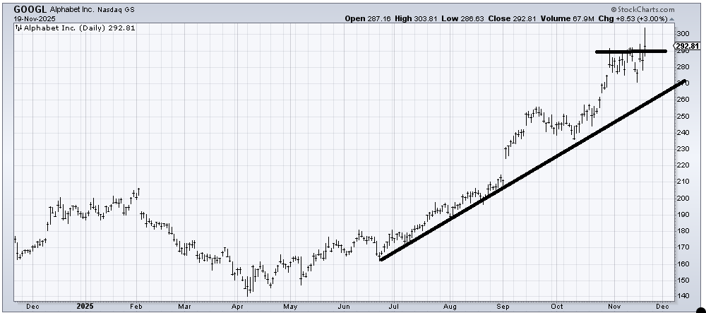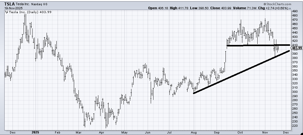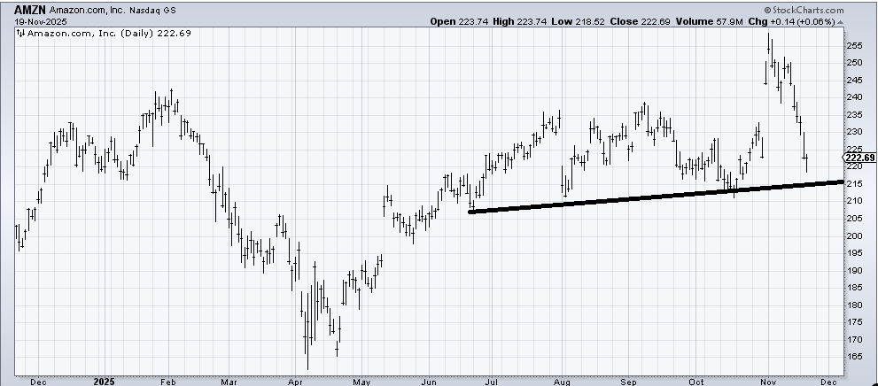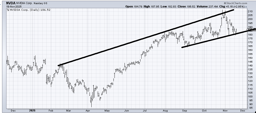 And then there is Nvidia (NVDA) , which has had a very decent year. I did turn cautious on it when it got to that upper line a few weeks ago because, well, resistance and a measured target. But it hasn’t broken the uptrend line; all it did was correct. It’s a fine stock chart as long as it stays over $180.