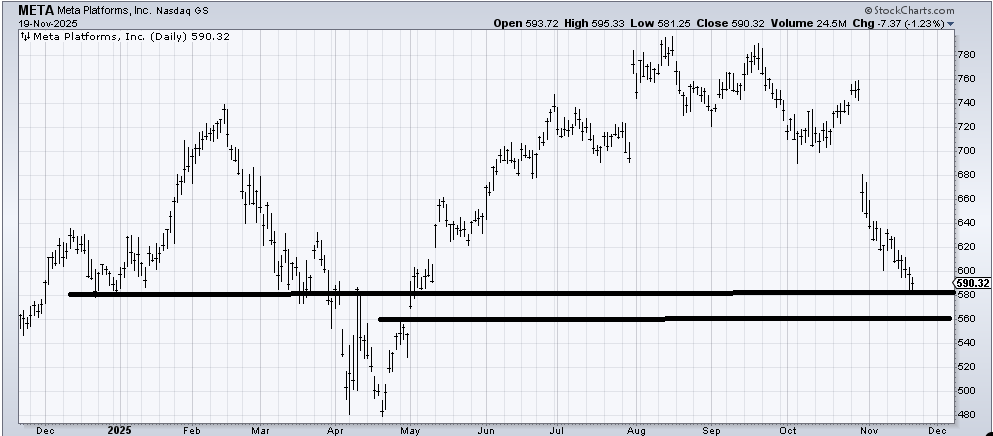 Meta (META) too is flat on the year. It also broke down from a top. In fact, it is down 15% since gapping down on earnings. It too looks oversold enough to rally, but is it really magnificent?