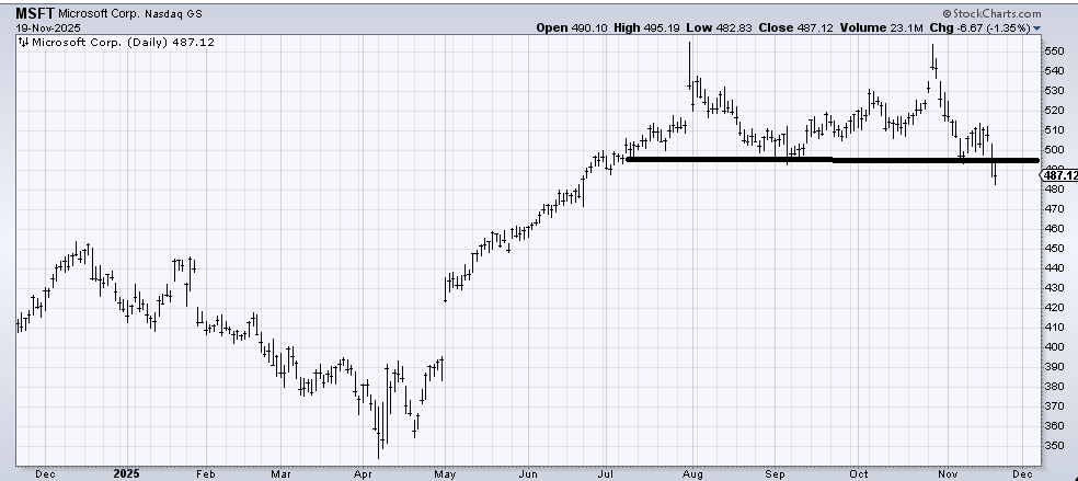 That brings us to Microsoft (MSFT) , which handily broke $500 this week. Those twin tops look like a bridge, and the stock has fallen off the bridge. Yet it is still up on the year, although it hasn’t gone anywhere since — wait for it — July. I will give this a chance in the next few days to recapture the line, but a failure to do so is not magnificent.