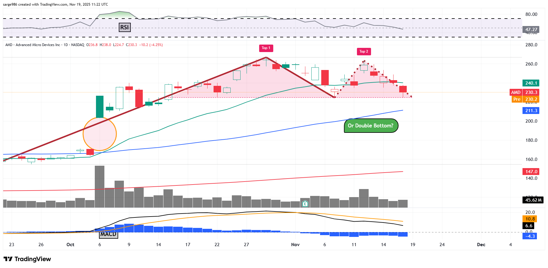 Double Top with a downside pivot of ​$224? There is that unfilled gap from early October that needs a $170 tick to fill. Then again, this could be a Double Bottom with a $263 pivot.