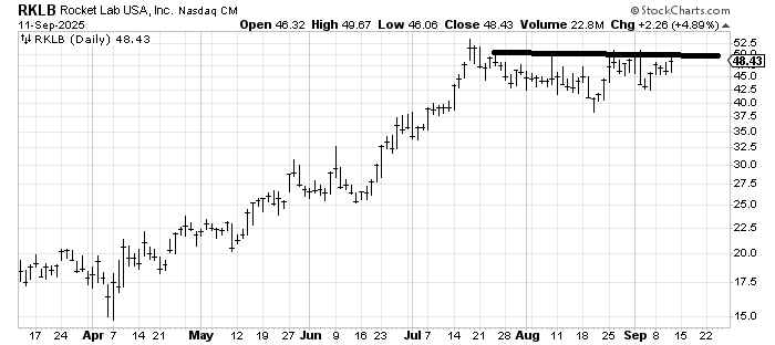 Remember when Rocket Lab RKLB was going up every day? But look at it since July: It peaked and corrected more than 20% in that time and is still under the early September high. But again, this is the type of action we’ve seen in a lot of stocks these past few months. It still needs to crack over 50 to convince us that it is finished with the correction.