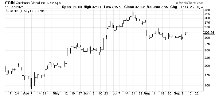 We’ll start with Coinbase COIN. Look at the peak in mid-July. The stock is nowhere near it now, but notice how it has spent the past two months in a correction. It hasn’t moved much but it ought to fill that gap over time, shouldn’t it?