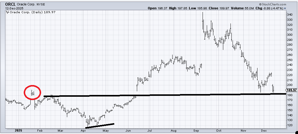 The stock then enjoyed an oversold rally, and now it is back to testing that November low and support. My view is that we typically get a short-term bounce off a spike low, but if we think about Oracle’s path this year, it follows the narrative of the year.