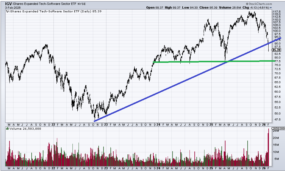 I can draw several different lines on the long-term chart of IGV but none of them will say, okay here’s the level. I might however note that the gap at 86 got filled and IGV closed at 85.39. What’s a few pennies among friends? I also might ask you to look at the volume on this five-year chart and tell me folks weren’t jumping ship today. That’s exactly what panic selling looks like.