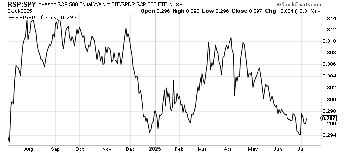 This brings me to the ratio of the RSP to the SPY. We looked at this before I left on vacation, and it is bouncing from the same level it has bounced from before. It should bounce some more, but similar to the energy ratio above, it needs to get over that little high at .0298 to get anything going.