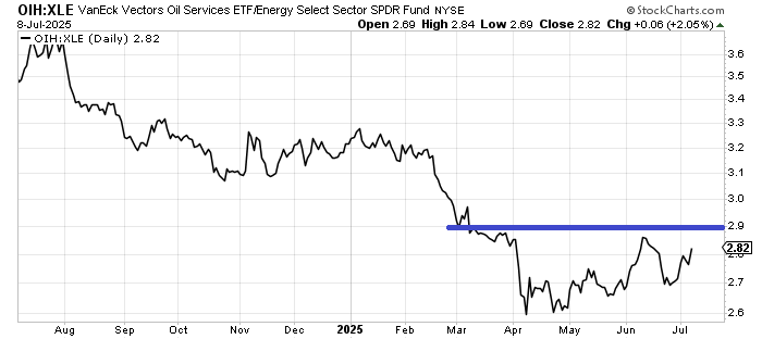 One reason I liked energy in late May was because the ratio of OIH to XLE was making higher lows. I always like it when the higher beta stocks of the group outperform the lower beta ones. I have my eye on that 2.9 area because the ratio really needs to get over that. Otherwise, this will start to look like that period from October to January when the ratio could not make a higher high.