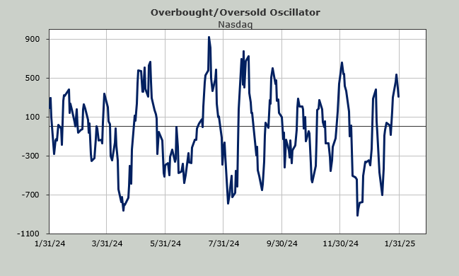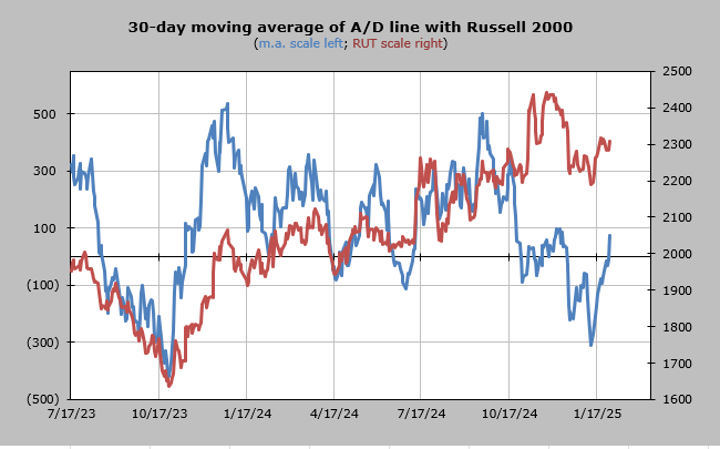 We have discussed the short-term overbought condition and how I expected a chop from it, and that’s what we have had, but let’s talk about the intermediate-term oscillator where I use the 30-day moving average of the advance/decline line. It finally (!!) crossed over the zero line. I have earmarked early February for a period when it ought to get to an overbought condition again, likely mid to late next week.