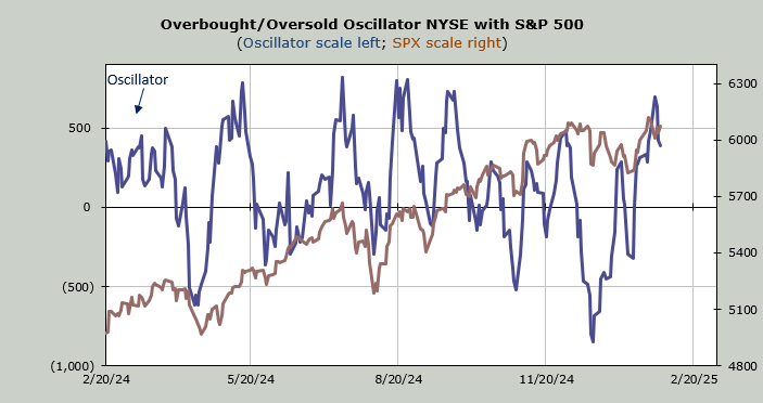 The Volume Indicator is now at 52%. It will get overbought in the mid-50s. I expect it will get there in early February as well. As you can see, the S&P has rarely responded to the overbought conditions, but the rest of the market has. Since the Index movers are no longer working as a pack, it will be interesting to see if the S&P can budge out of its range.