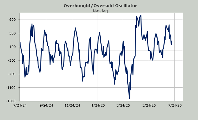It is not oversold. But overbought and oversold are momentum indicators and for the last week or so the market has been stuck, it has lost the upside momentum. In fact on July 9, the S&P closed at 6263, the same level it closed on Wednesday. If that is not a loss of upside momentum, I don’t know what is.