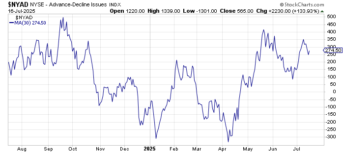 The intermediate-term is still overbought. Here you can see the 30-day moving average of the advance/decline line. It made a lower-high than May and remains well above the zero-line.