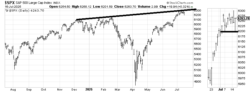 Nearly two weeks ago, I drew this line on the chart of the S&P, indicating resistance. It still has not breached it. The line is rising so it now comes in just over 6300. Now look on the right side of the chart and you can see I have blown up the last couple of weeks in the market. Do you see how we have bounced off 6200 on both of the days we had a downdraft?