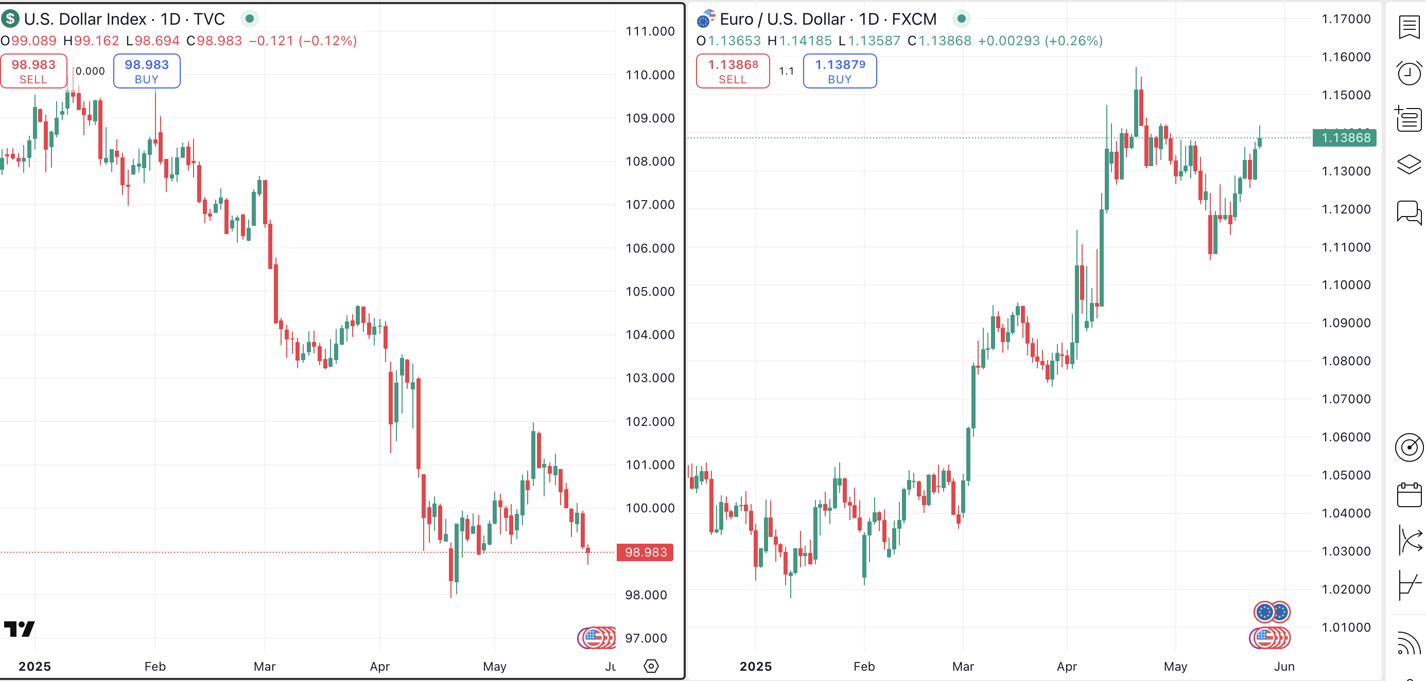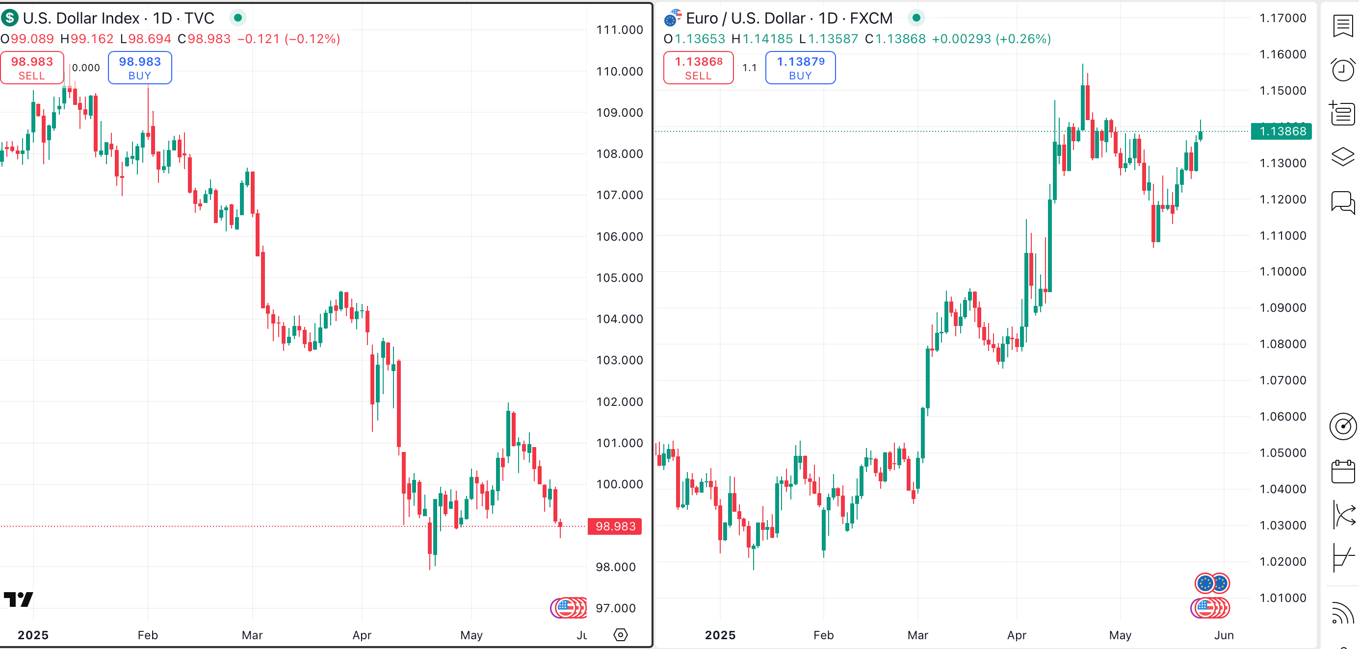 On the right, we see the euro simultaneously rising as the U.S. dollar falls. Both charts begin at the start of this year. Notice how the two charts have a strong negative correlation, and understand that this has always been the case.
