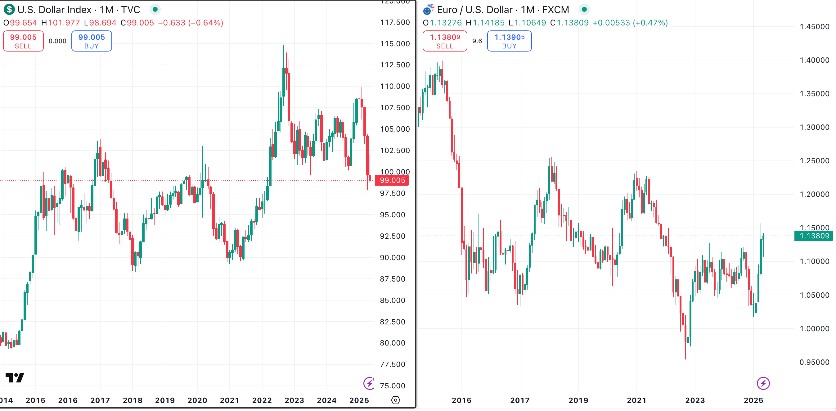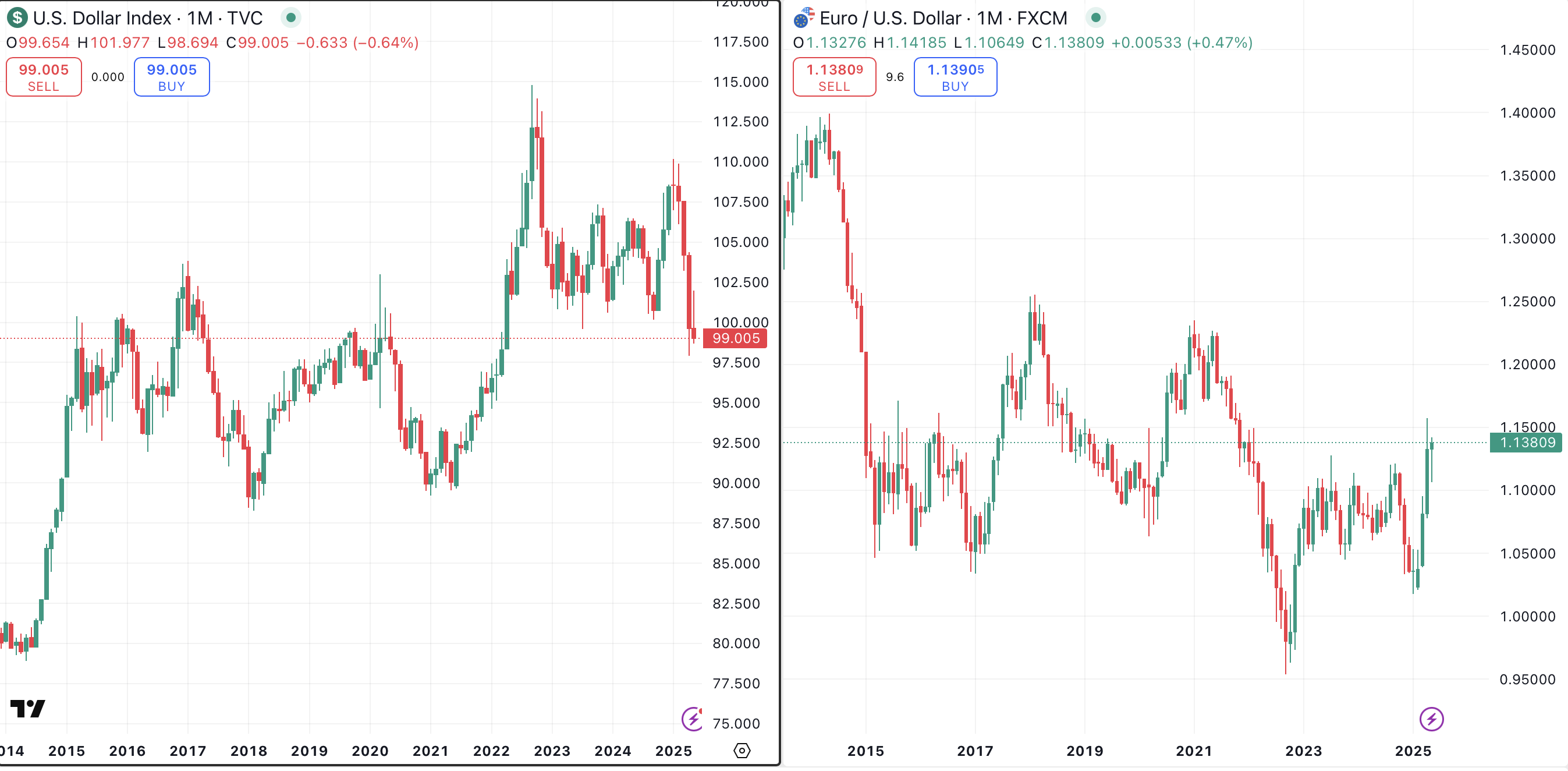 One dollar is always worth one dollar. One euro is always worth one euro, and so on. Because of this, currency traders have always expressed currency values in terms of other currencies. This is done via currency pairs, like EUR/USD, or currency indexes, like the U.S. Dollar Index.