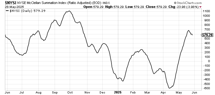 We have seen the McClellan Summation Index turn down. It’s not in a full-blown downtrend yet, but it takes an awful lot to turn this down and keep it down, which is why I’m watching it so closely.