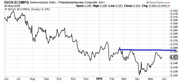 Can NVIDIA change the relationship the SOX has had with Nasdaq for more than a year? When we look at the ratio of the SOX to Nasdaq, we see a downtrend. There hasn’t been a higher high on a relative basis in more than a year. I would say the NVDA earnings after the bell on Wednesday will surely test this.
