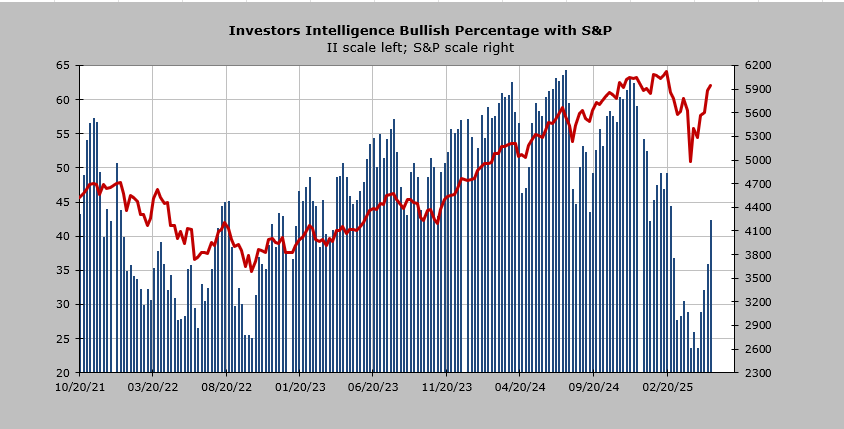 As for the sentiment, as I noted in the comments yesterday, the Investors Intelligence bulls jumped six points to 42.3% and the bears fell to 26.9%. This is the first time there are more bulls than bears in more than two months. That is the change in sentiment I expected would arrive this week.