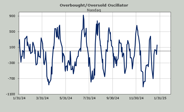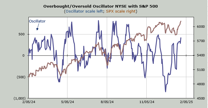 Why is that important? Because a lower high in the Oscillator means lower momentum and a higher high (over 500, because that’s where we were in December) implies momentum is overextended but not failing. Either way, using this indicator we are getting short-term overbought.