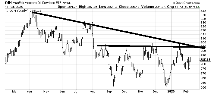 In the meantime I have my eyes on OIH, which is trying to get better. Three hundred is big resistance but this is another chart that has been sideways for six months that hasn’t broken down. Does it want to breakout to the upside?