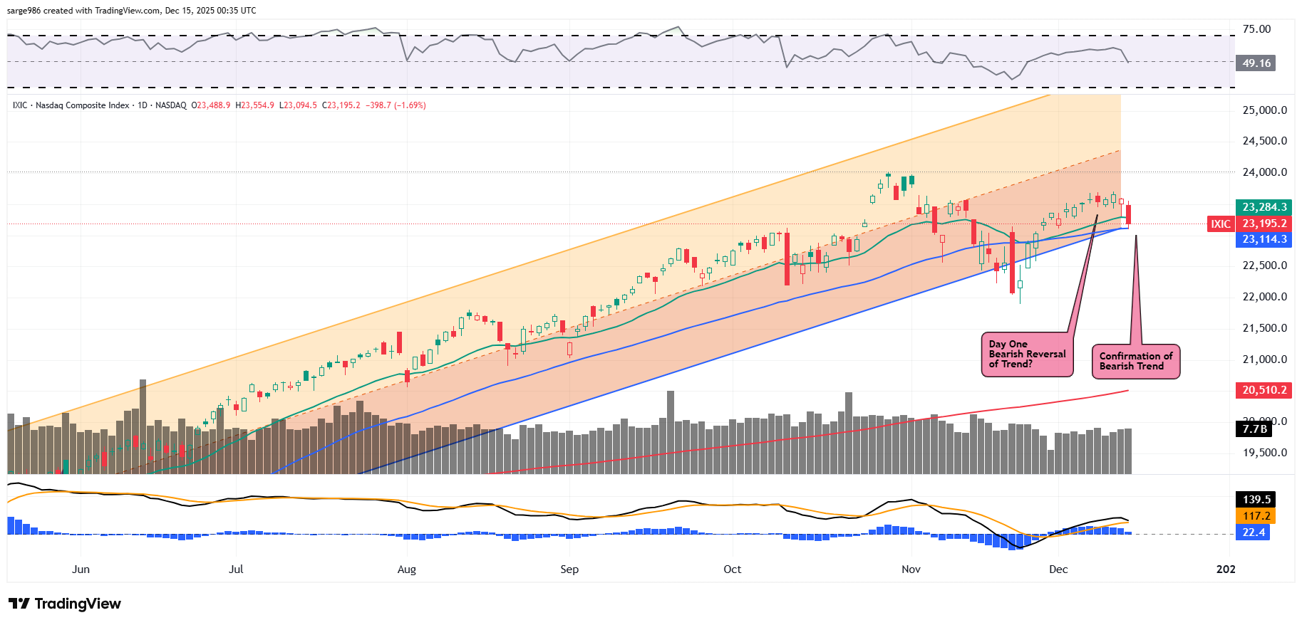 Four, both the Bearish Day One and Day of Bearish Confirmation are less pronounced on a daily chart of the Nasdaq 100. One would think that if a rotation out of big tech were driving a change in trend that this would not be the case.
