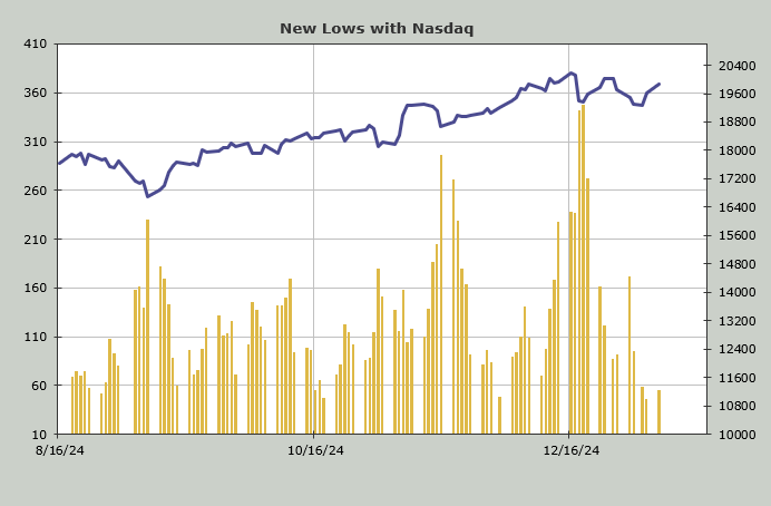 If breadth turns negative, sentiment likely will as well, although the Mag 7 would have to stall or turn south, too. But take a look at the number of stocks making new lows on Nasdaq. When Nasdaq was at 19,300 at the FOMC Low, there were 347 new lows. The new lows at last week’s 19,280 close were a mere 171. So, I ask myself if Nasdaq fell 600 points from here, do I think there would be more than 347 stocks making new lows? No, I do not. And that would be a positive divergence.
