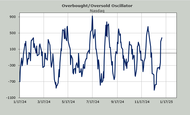 We looked at the Overbought/Oversold Oscillator yesterday and I noted that it was reaching toward an overbought reading. That is still the case. That is what happens when breadth is positive for seven of the last ten trading days.