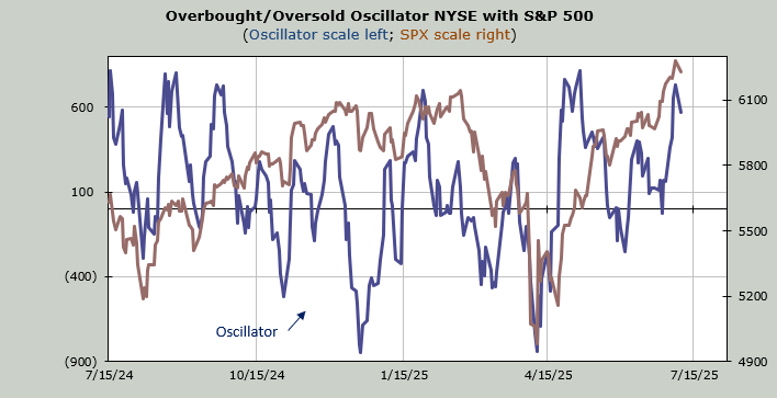 Let me point out that a break of 5400 would only measure down to fill that gap near 5200, but it would be the first break and the first lower low. Notice that the mid and late May lows were twins, as were the two from mid June (around 5100). Thus, a break of 5400 would be a change in pattern.