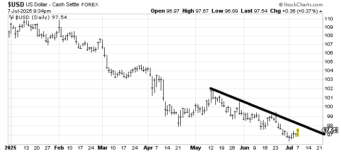 There was one big change in the market that I saw on Monday that got very little fanfare. It was the move in the US Dollar. Oh sure, here I go again, waxing on how I think the buck will rally, but notice the Dollar Index is making a one-week high. I cannot declare any real change there (much as I would like to) unless/until it crosses over 98. That could clear the downtrend line as well as the two prior lows (the one in mid-April and the one in mid-June). Thus, like the SOX breaking 5400, that changes the pattern.