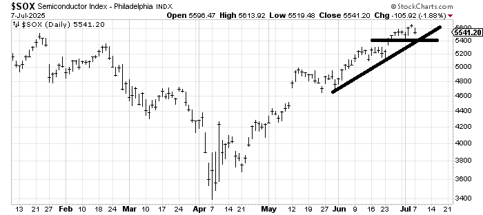 If you are looking for a level to watch (folks seem to love levels), then I would watch the 5400 area on the SOX. There are two lines there. First, we have that uptrend line dating to the late May low that comes in (this week) around 5400. And it was the low from a week ago. Okay, I know, it really was 5500, but I like to give things some leeway.