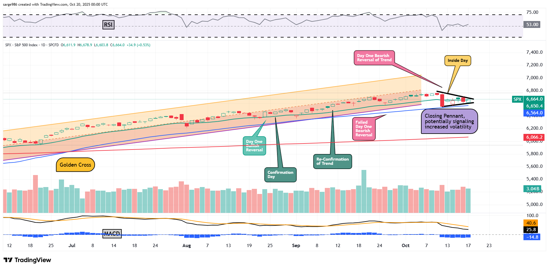 Equity markets sold off rather severely on Friday, Oct. 10. Last Monday, Oct, 13, equities rallied, taking back some of that lost ground. Some readers may recall that I pointed out in this column on Oct. 14, that the day before had been what we refer to as an "Inside Day," which is a one-day pattern that often signals a short-term reduction in volatility. Well, we certainly did have some give and take over the balance of the week. The S&P 500 has not moved in the same direction two days in a row since Oct. 9 and 10.