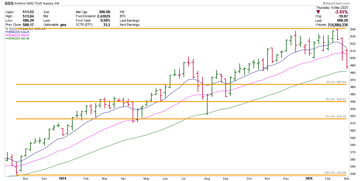 I’m focused on the 50-week exponential moving average (EMA). To find a time when QQQ traded below the EMA, you would have to go all the way back to the first quarter of 2023. That’s two full years of trading. We tested that level in August 2024 and October 2023, but we’ve barely challenged the 25-week EMA aggressively, let alone the 50-week EMA.