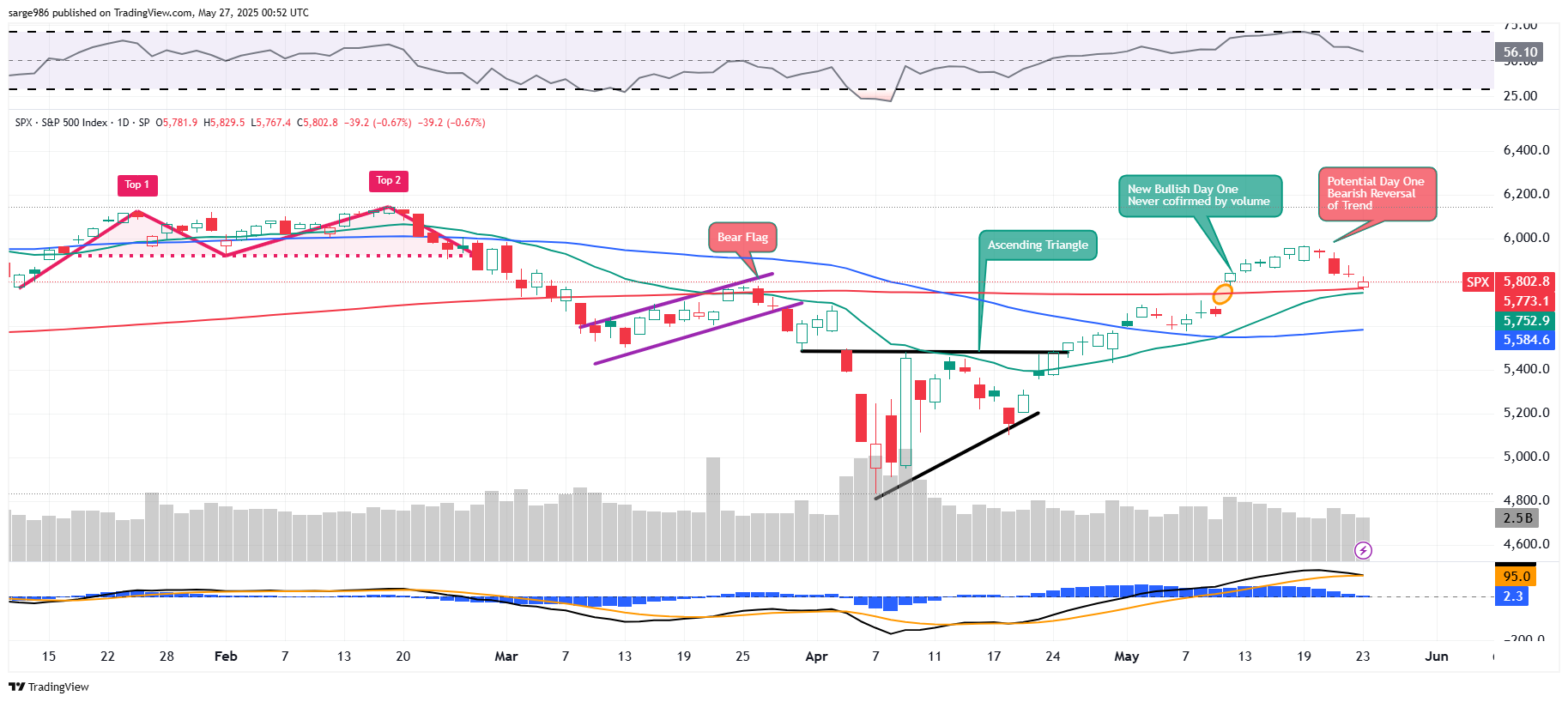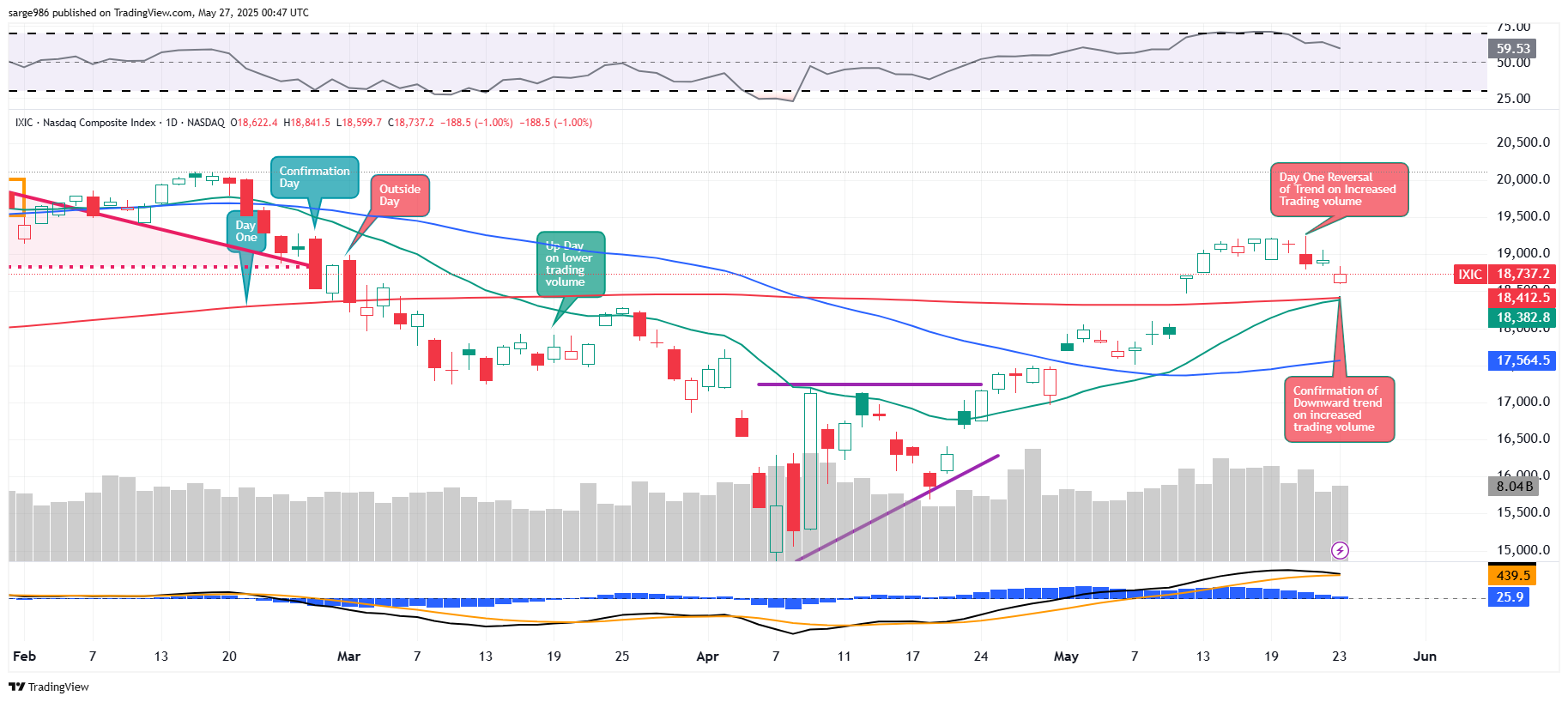 Readers will see that the Nasdaq Composite followed up the Day One Reversal of Trend on May 21st with a Day of Confirmation (confirmed by volume) on Friday. Readers will also see that as relative strength came off of nearly overbought levels, within the daily Moving Average Convergence Divergence, the 12-day exponential moving average appears set to cross below the 26-day exponential moving average. This would be bearish but has not yet happened. The president's announcement on Sunday may have checked, for now, this confirmation. Oh, by the way, this dropping of the next shoe was never completed as there was no such volume-based confirmation across the S&P 500.