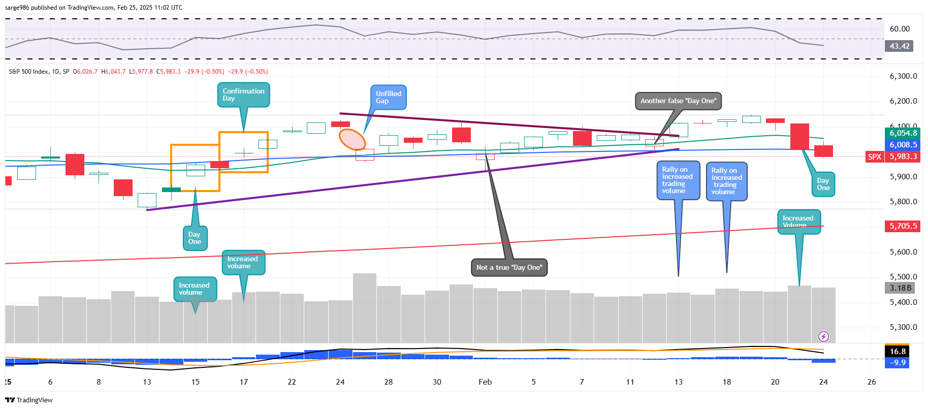 The continuance of the selloff across equities on reduced volume does not constitute a confirmation of Friday's potential "Day One" bearish change in trend, but really presents as part of the same move, and a move that may possibly be growing exhausted. Either that, or timid in front of Nvidia's numbers.