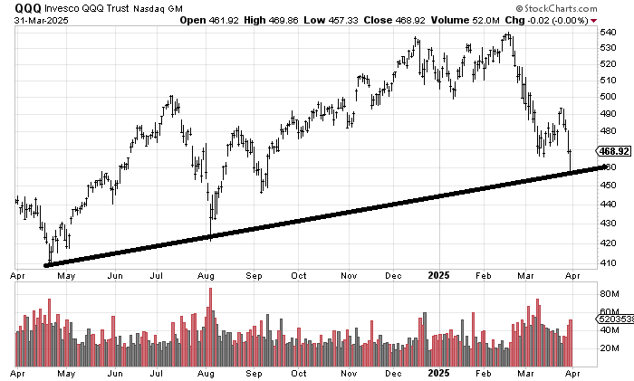Before we get to the action from Monday, I want to give a shout-out to all those people on television who keep trying to compare this move in the market on ‘tariffs’ to 2018. How can you compare a market that has fallen 20% (2018) with one that has fallen 10%? (now) I just don’t see the comparison.