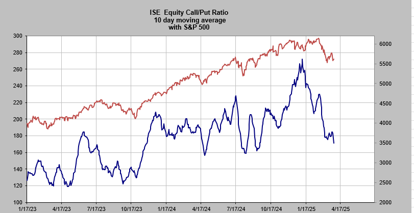 We haven’t looked at the ISE Equity Call/put ratio much (I tend to use the total), and its reading was not particularly low on Monday. However, over the last six weeks, it has been trending lower, and that means the ten-day moving average is now closing in on 1.6. In the last year, this level has led to rallies (prior to last year, a reading closer to 1.20 gave us a rally).
