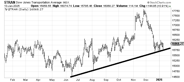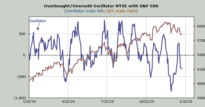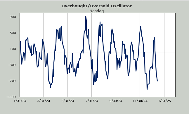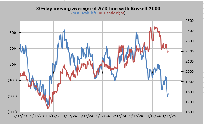 Yet the intermediate term indicators are getting oversold. The Volume Indicator sits are 46% so that’s oversold. The chart was shown here last week. The 30 day moving average of the advance/decline line is just about oversold now too. In fact it is almost—not quite—where it was, in terms of being oversold, in the fall of 2023.