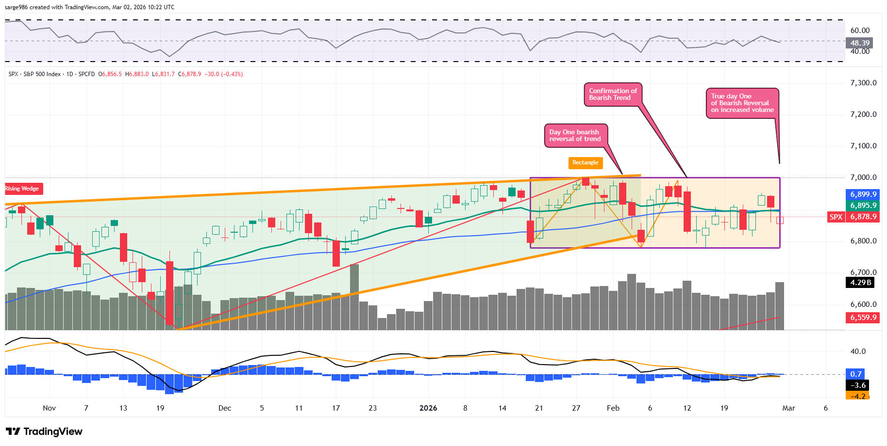 ​Readers will see the Rising Wedge Pattern of bearish reversal that we showed you last week led into a basing period or rectangle of consolidation. Though it is quite clear that on Friday, the S&P 500 suffered a Day One Reversal of Trend to the downside (though it was the second day of the sell-off). This action was punctuated by the increase in trading volume.