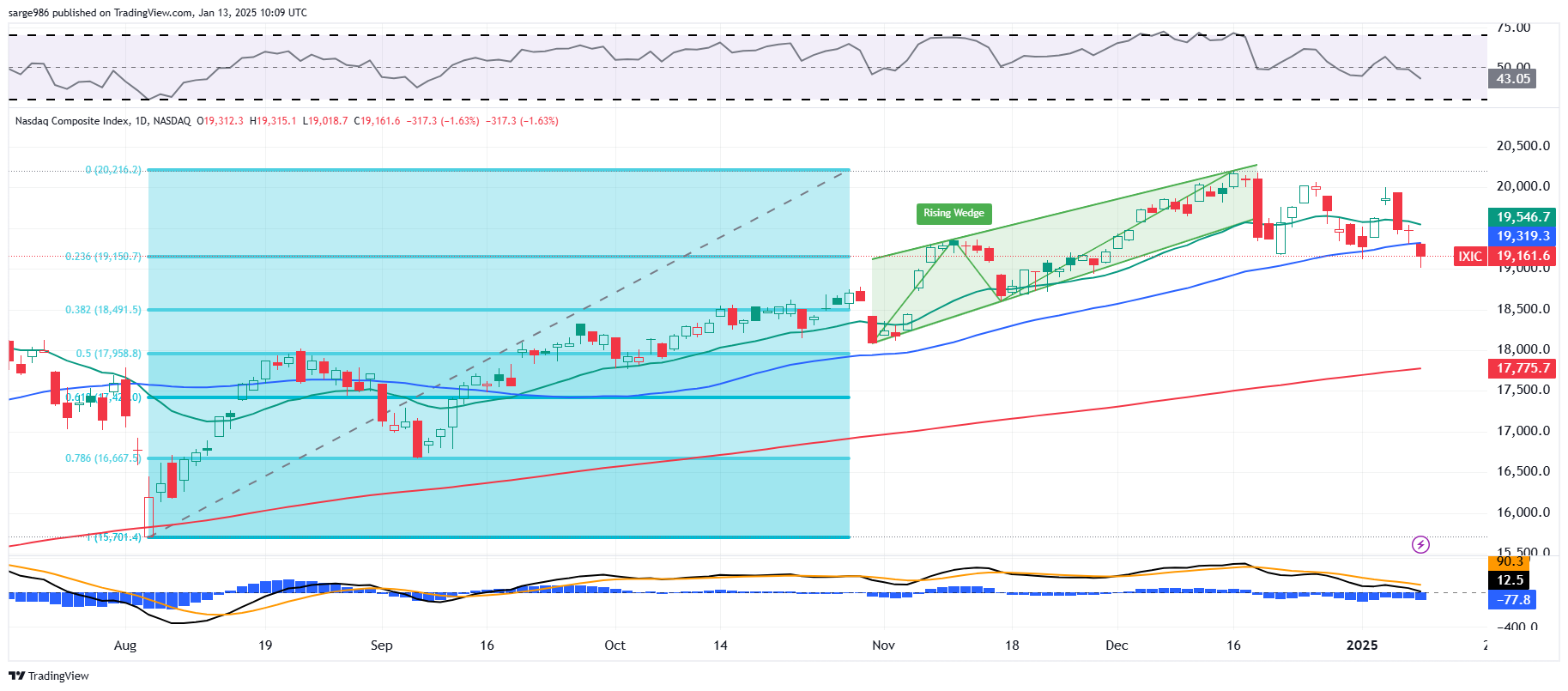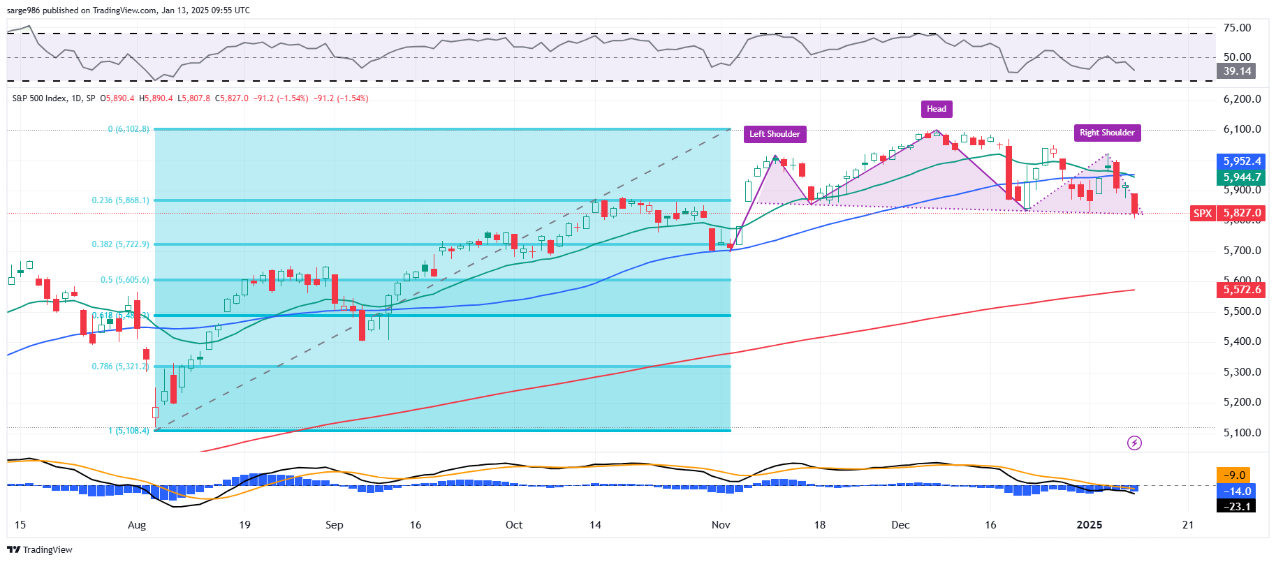Where did the S&P 500 close on Friday? That's right, 5,827. Should this neckline crack, which at zero dark-thirty on Monday morning looks likely... Readers are reminded that the half-way back point or 50% retracement of the August into December rally stands at 5,605.