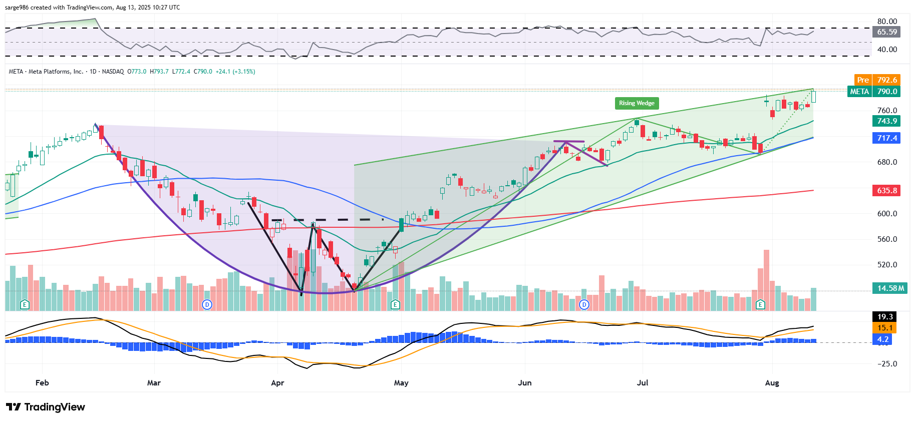 Is Meta Platforms META still breaking out from the Cup With Handle pattern that developed this past winter into spring, or is the stock developing a Rising Wedge pattern of bearish reversal?