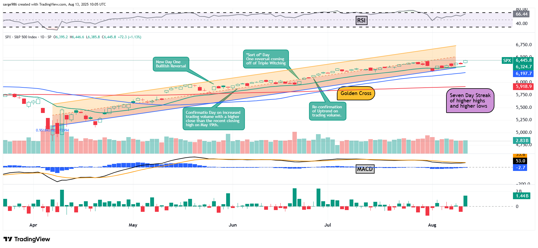 Now, I added what we call a "Volume Delta" indicator at the bottom of the chart. This is not an indicator that I attach to every chart, but it is in my tool kit. Volume Delta uses intra-bar volume and price fluctuations to estimate the gap between upward and downward pressure within the time frame of the candle, which on this chart is a full day. Take a look at Tuesday's Volume Delta. Tuesday sent the strongest positive signal since June 25th. The S&P 500, just as an FYI, is up 5.8% since the closing bell on June 25th.