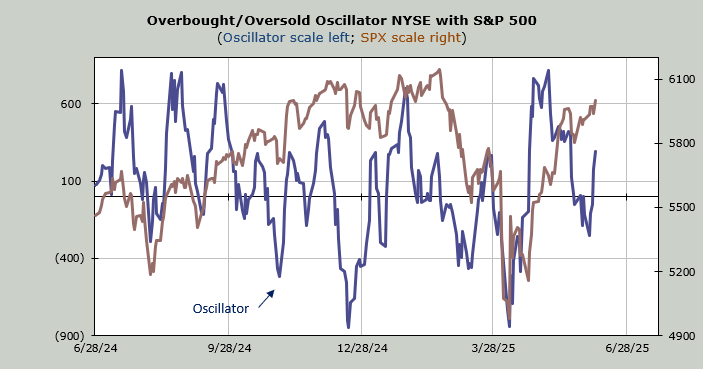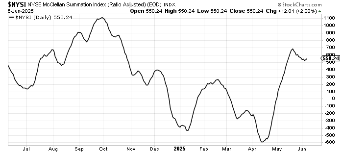 Recall, before the employment number, I viewed it as neutral because it only needed a net +500 advancers minus decliners on the NYSE to stop the decline. I view it the same today because now it needs -500 to turn it back down. In other words, when one day of trading can swing this up or down, it hasn’t changed. Yet.