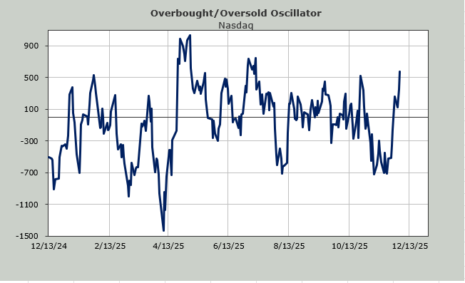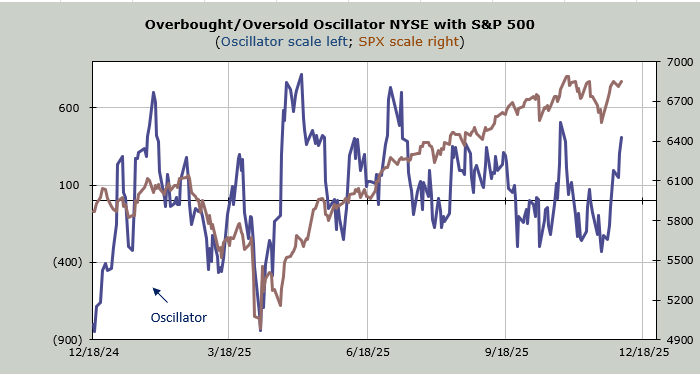 Away from that, the S&P is now flat on the week as we head into the short-term overbought condition I expect at the end of this week. Much will depend on what the breadth does in the next two days as to whether or not the Oscillator will make a higher high than it did in October. Thursday is a toss-up, but I expect on Friday we will see the Oscillator push upward one last time.