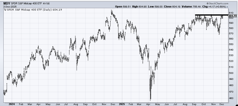 Naturally, this forced me to check in on (MDY) , an ETF to be long Mid-Caps. As a refresher, I am fascinated by this because so many folks say they don’t like small caps but are fine with mid caps. I grant you, I haven’t heard that in a while, but it doesn’t stop me from checking in on this chart.