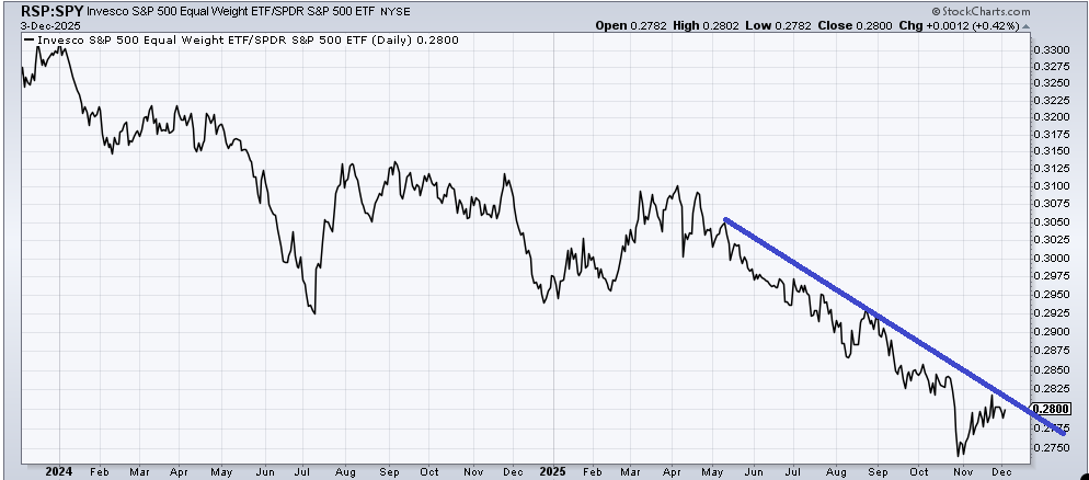A few weeks ago, I was asked to take a look at the ratio of the equal-weight S&P (RSP) relative to the S&P. At the time, I saw nothing to write home about because it had been in a downtrend (S&P outperforming RSP) since we came off the April lows.