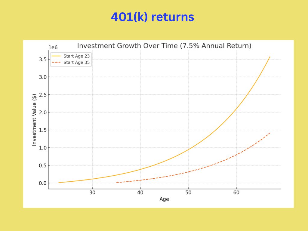 - Starting at age 35: Investing $10,000 annually from age 35 to 67 with the same 7.5% return.