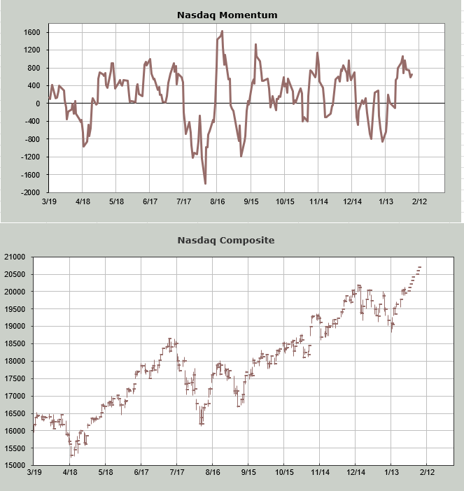 I have even done some ‘what-if’ work on the Nasdaq Momentum Indicator. Here, instead of breadth, I use price. I plug in higher closes over the next week or so (in this case, I walked Nasdaq up about 750 points) to see when the Momentum Indicator peaks. That occurs on Tuesday. Remember, the exact day is not what matters; it’s the general time period. So this confirms what my Oscillator is saying: short-term overbought this week.