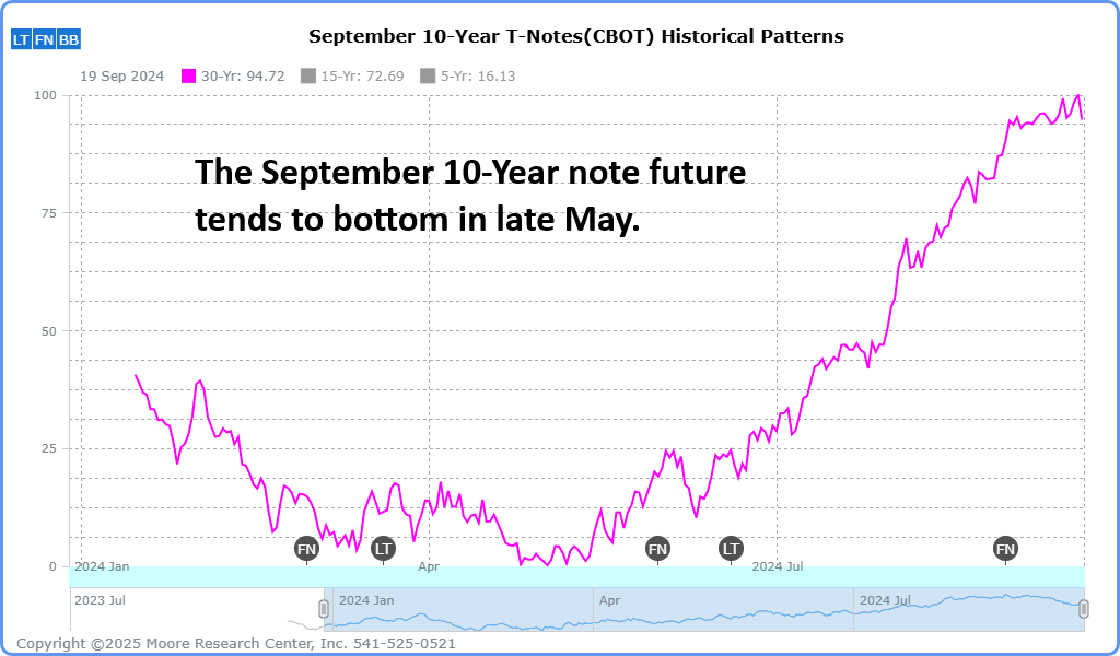The Treasury futures market tends to find a significant low in the early summer months and rally into fall. Although seasonality isn’t certain, it is likely.