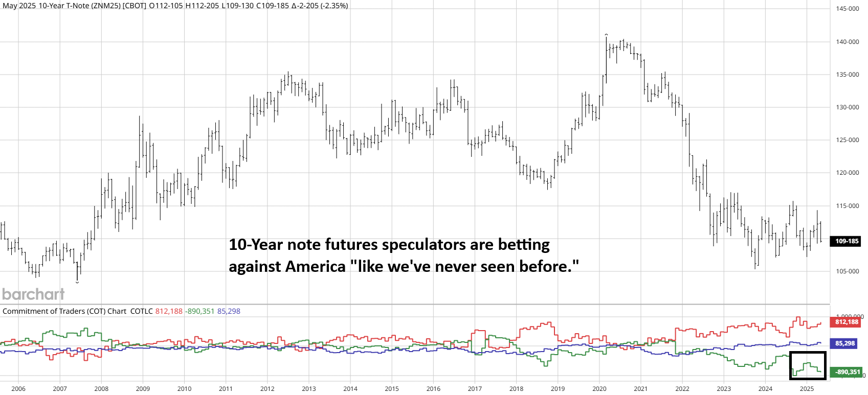 Large speculators have been holding historically significant bearish bets against U.S. Treasuries. These bets against America are being placed in anticipation of a repricing of the bond market to account for increased default risk and a lower credit rating by Moody’s. However, the bulk of the selling took place a few years ago; since then, the shorts have maintained their position because they have yet to be proven wrong. But if that time ever comes, there will be substantially more buyers in the market than sellers, and the rally will rip faces off without regard to humanity.