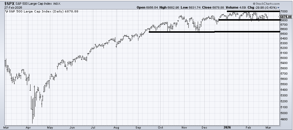 In fact, the S&P’s range has tightened up since the calendar turned to 2026. I keep referring to that 6800 area (which is really more like 6775), but you can see on the chart that the last time we traded under it was when we fell out of it for a day at the December low.