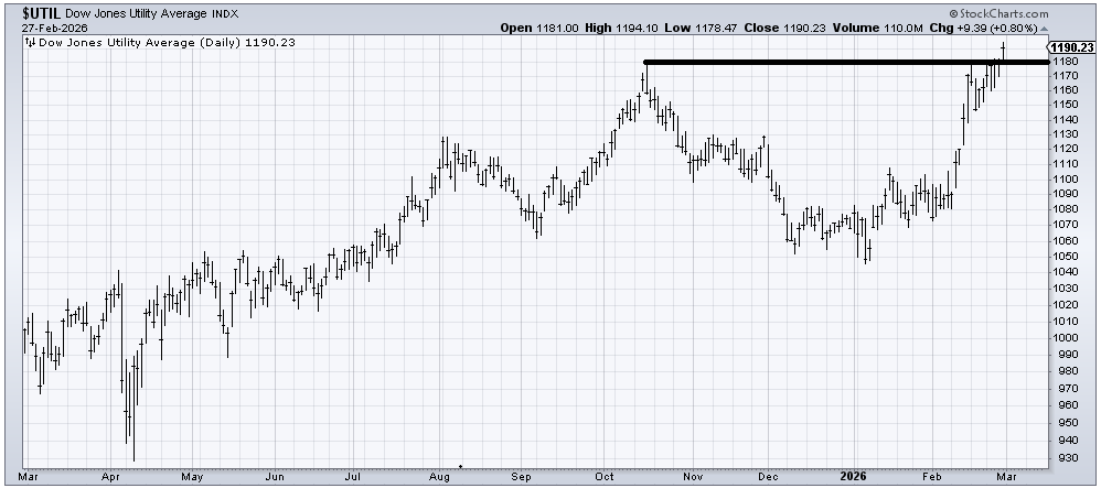 The flip side of all of this is the Utes, which I have been fond of for months now. They broke out on Friday to a higher high. This is good news. Now the bad news: they are not only quite overbought up here, but Barron’s, after a ten percent move in February, finally saw fit to put them on the cover. I would not chase them up here, even though it appears to be a breakout. I suspect they will pull back in the weeks ahead.